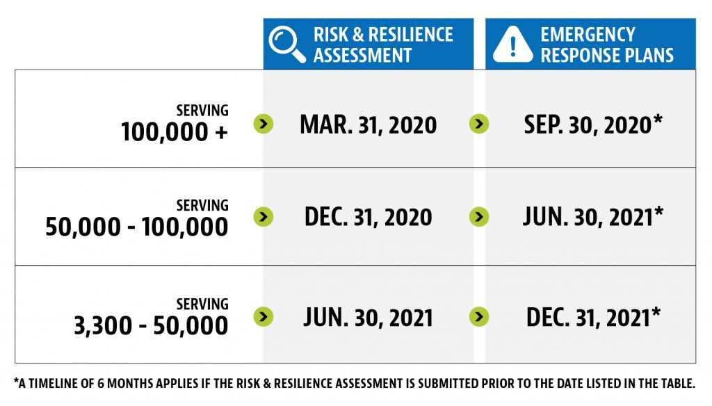 The first AWIA deadline for Community Water Systems serving more than 100,000 to submit a certified Risk and Resilience Assessment for review and acceptance by the U.S. Environmental Protection Agency (USEPA) was on March 31, 2020. The deadline for utilities serving 50,000 to 100,000 to submit a certified Risk and Resilience Assessment is December 31, 2020, and the deadline for utilities serving 3,300 to 50,000 is June 30, 2021.  The corresponding Emergency Response Plan must be certified and submitted within six months of the date of submittal for the Risk and Resilience Assessment. It is important to note that even in the face of a pandemic, no deadlines were extended, since AWIA is targeting events like a pandemic as part of water systems planning.
